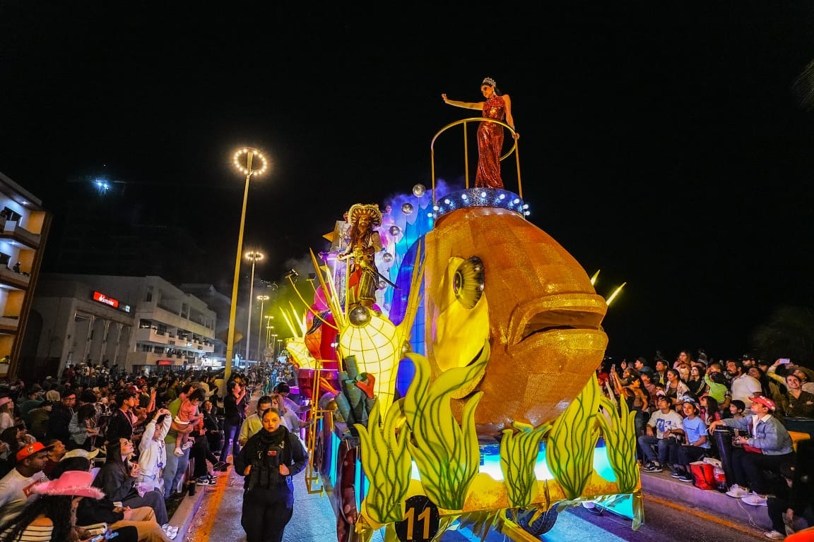 El desfile fluyó sin contratiempos, mostrando carros alegóricos llenos de luz, brillo y color, alegres comparsas, bandas musicales y simpáticos peces y otras figuras marinas a bordo de bicicletas. Destacaron dos figuras de gran tamaño inspiradas en seres que dan identidad a Mazatlán: un venado gigante en movimiento y una ballena articulada. Ambos atraparon miradas y emocionaron a los espectadores.